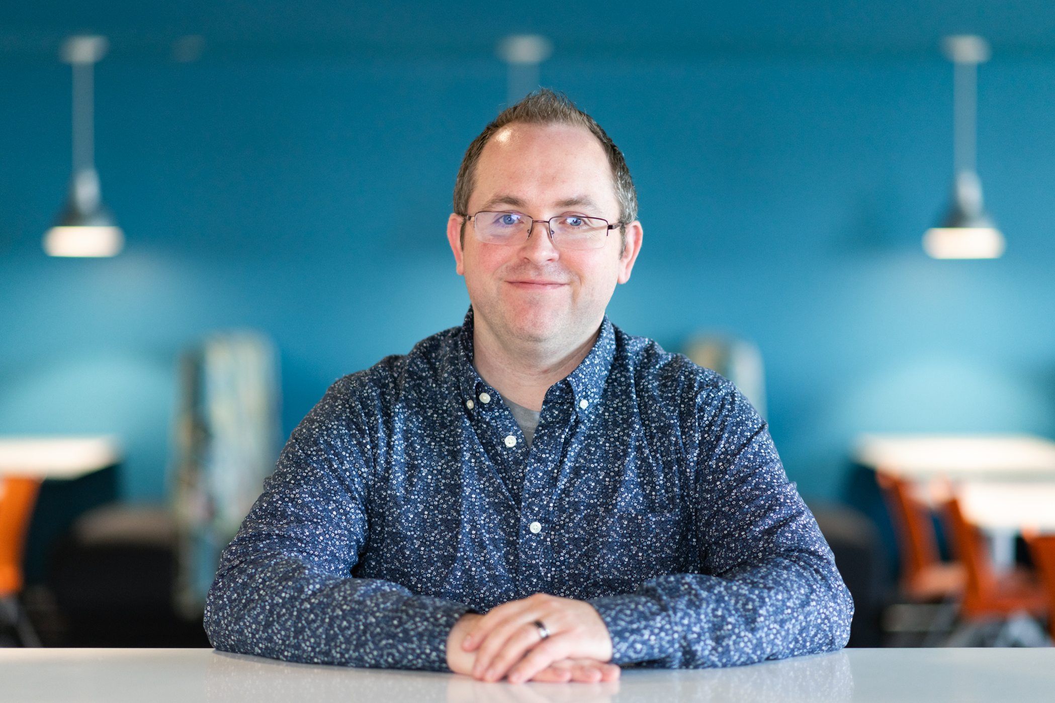 A professional man with rectangular glasses, blue eyes and slightly spiky hair, wearing a blue shirt. Highly detailed, animated cartoon, smiling.