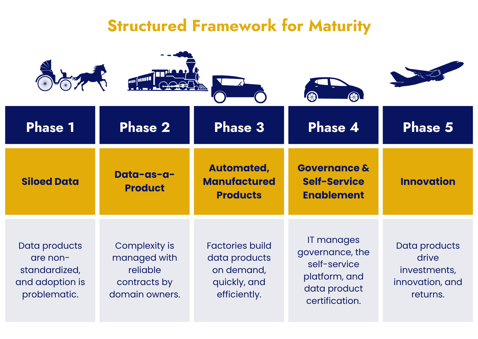 Data mesh adoption will be different for each organization, but Marlabs’ structured framework for growth will give you an overview of what a typical journey to data mesh maturity looks like. Most organizations start from a place of siloed data and disconnected domains. As they develop a foundation of product management thinking around data, they then grow towards more efficient, automated systems for producing data products. A mature data mesh architecture then entails organization-wide governance and self-service enablement, and all of this comes together so that data products drive innovation, investment, and ROI.